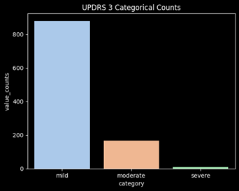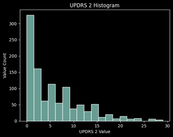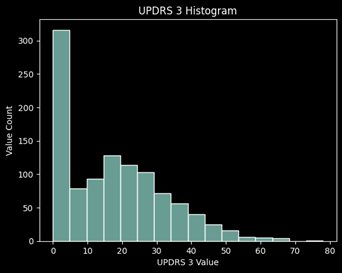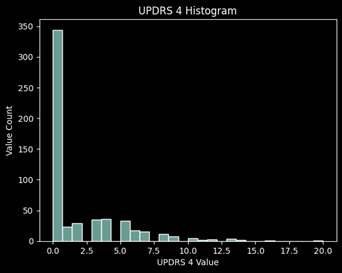 Looking at the missing values for each UPDRS, roughly 45% of the values are missing for UPDRS 4 which concludes me to remove this target from the prediction. It is primarily 0’s and has almost half of the values missing, thus it will not be a good target to learn from and predict.